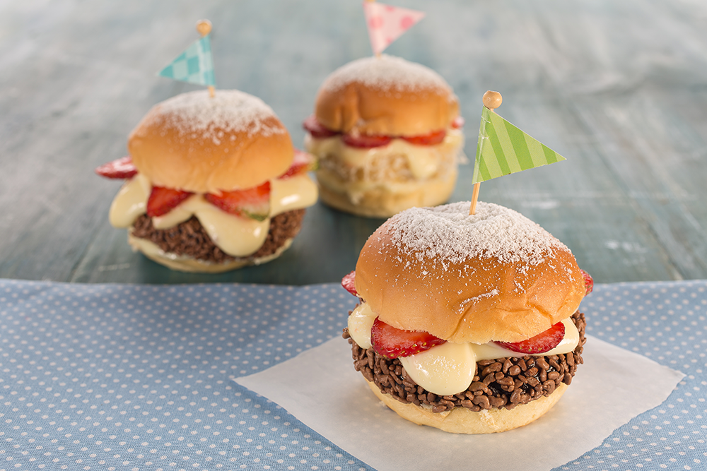 Corte o pão de hambúrguer, coloque o hambúrguer de brigadeiro, espalhe o creme de limão, coloque os morangos fatiados e por último a outra fatia do pão. Finalize peneirando Açúcar Gelado.