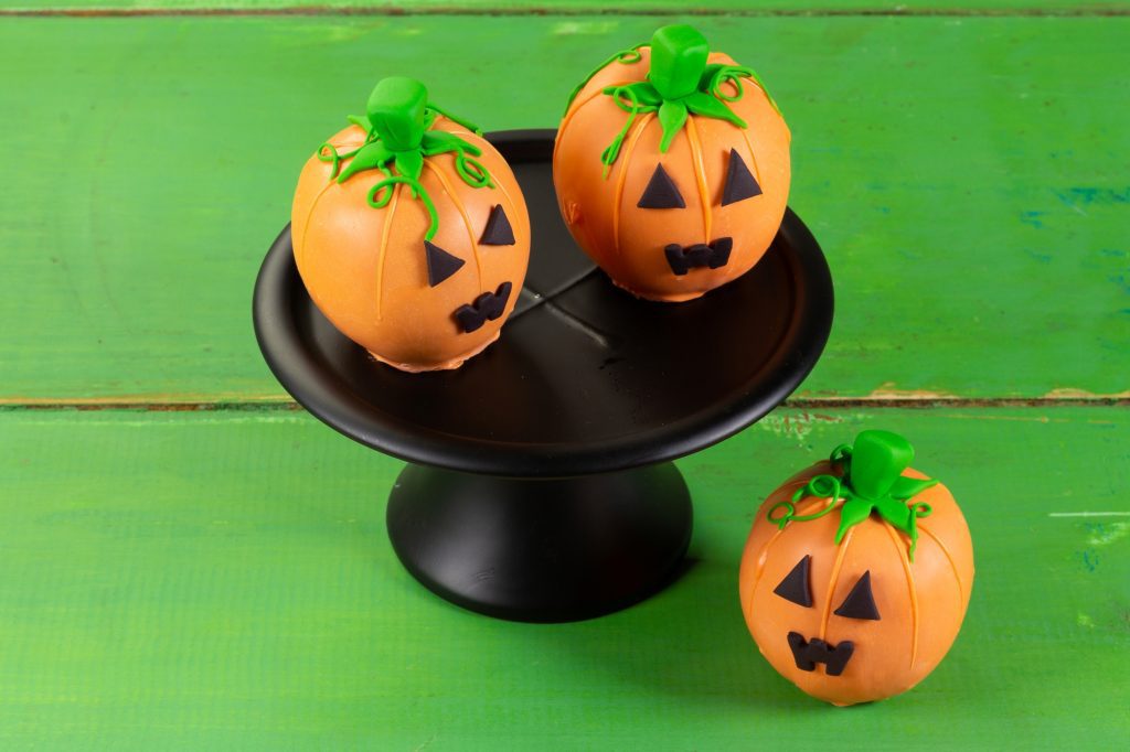Para Decorar: Tinja a Pasta Americana com corante em gel verde folha e preto. Com a Pasta verde folha modele o talo da abóbora e com a pasta preta faça os detalhes dos olhos e da boca.