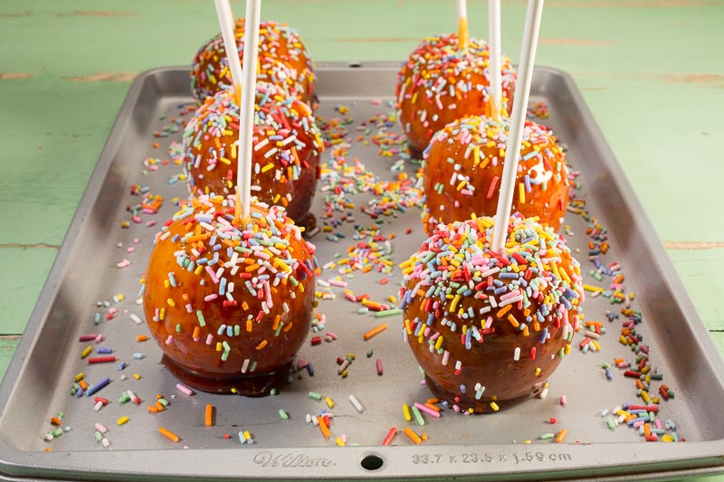 Em uma panela coloque o Açúcar Branco, a água, a glucose e o vinagre branco. Leve ao fogo e deixe ferver até começar a ficar na cor de caramelo. Desligue o fogo e banhe as maçãs já com o palito e em seguida decore com Granulado Colorido.
