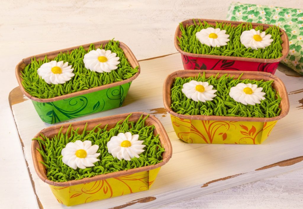 Flor Margarida e Graminha: Bata na batedeira utilizando o batedor raquete o Pó para Glacê Real, a água por 10 minutos. Em seguida divida em dois recipientes. Em um recipiente tinja com corante verde folha e verde musgo, misture até ficar na cor desejada. Coloque o glacê branco em uma manga de confeitar com bico 102, pressione pétalas sobre um papel-manteiga, coloque um chocogiros amarelo para o miolo e deixe secar. Coloque o glacê verde em uma manga de confeitar com bico 233 e pressione fazendo a graminha. Em seguida coloque as flores.