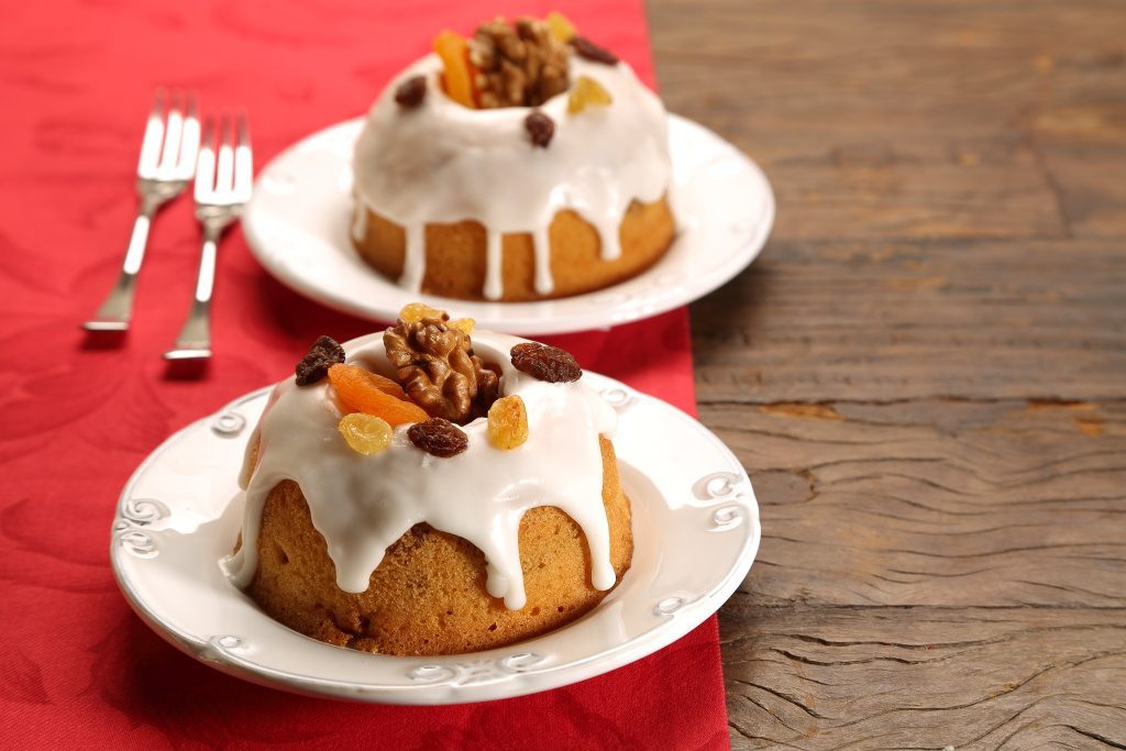 Montagem e Decoração: Aqueça o leite e acrescente no Açúcar de Confeiteiro, misture bem e espalhe sobre o mini bolo. Decore com frutas secas.