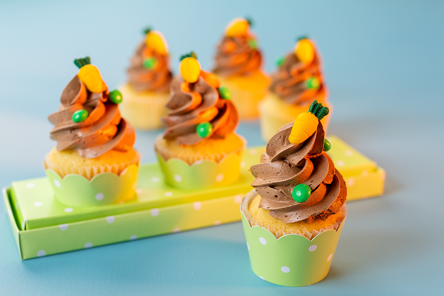 Coloque a cobertura de mousse de brigadeiro em uma manga de confeitar com bico pitanga, faça o topo do minicupcake e decore com minicenoura e Chocogiros Verde.