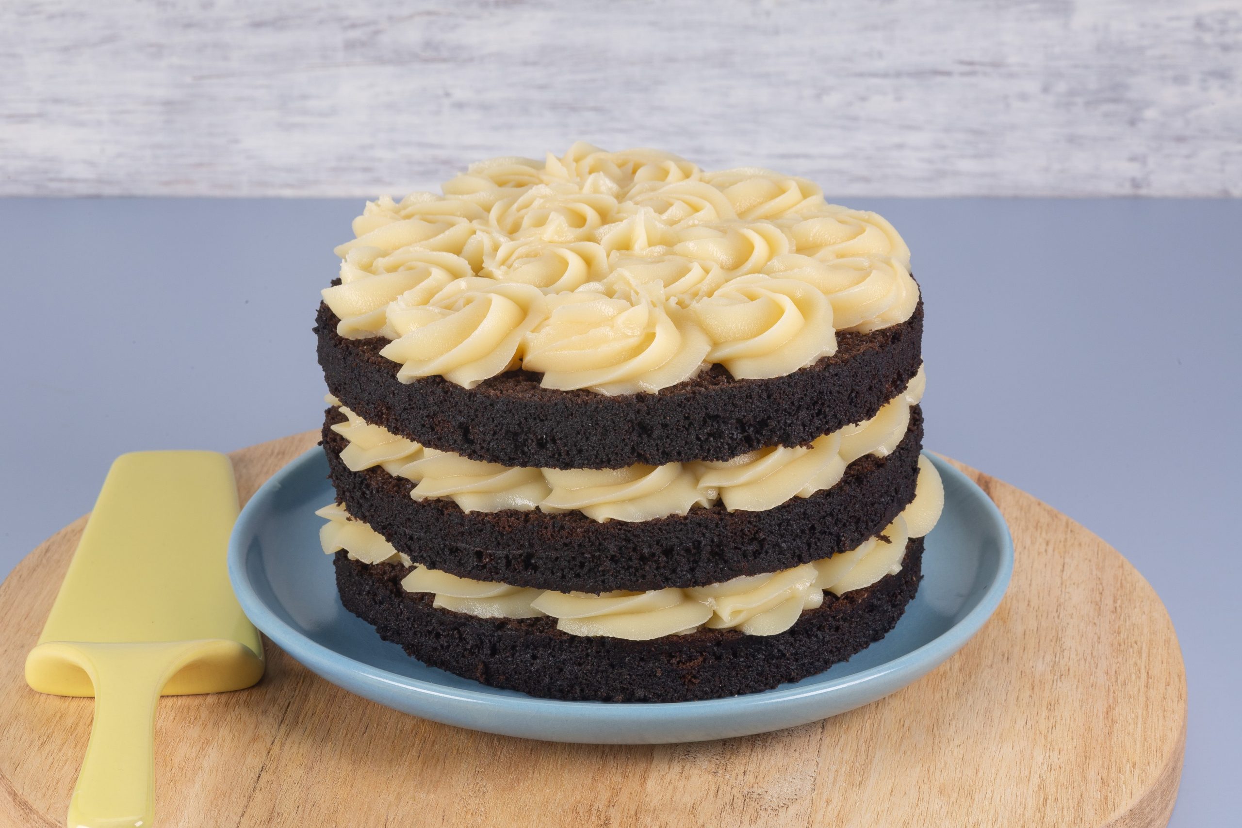 Montagem e Decoração: Coloque o recheio creme de leite em pó em uma Manga de Confeitar com Bico 1M. Em seguida intercale camadas da massa, da calda de chocolate e pressione o recheio fazendo rosas.