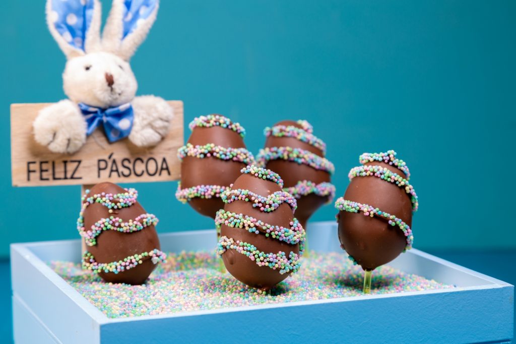 Recheie as casquinhas com o recheio delícia, coloque um palito no centro do ovo e espalhe a Cobertura na borda da casquinha, cole as partes e deixe secar. Em seguida, derreta a Cobertura Blend em banho-maria ou micro-ondas, coloque em uma manga de confeitar, faça detalhes nos ovinhos e em seguida passe nos Confeitos Miçanga Baby.