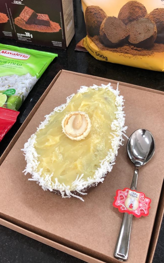 Recheie a casca com o creme e com pedaços do brownie. Finalize passando a borda da casca no coco ralado.