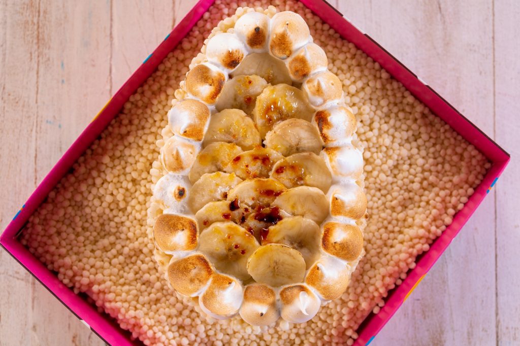 Intercale na casca do ovo, camadas do brigadeiro branco, doce de leite e banana fatiada. Coloque o marshmallow em uma Manga de Confeitar com Bico 2A, decore a borda do ovo e, no centro, coloque banana fatiada. Por último, peneire Açúcar de Confeiteiro e passe o maçarico.