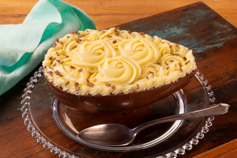 Coloque o brigadeiro cremoso em uma Manga de Confeitar com Bico 1M e preencha a casca do ovo e decore com rosas. Coloque o brigadeiro cremoso em uma Manga de Confeitar com Bico 21 e decore a borda do ovo. Finalize com Flocos Crocantes.