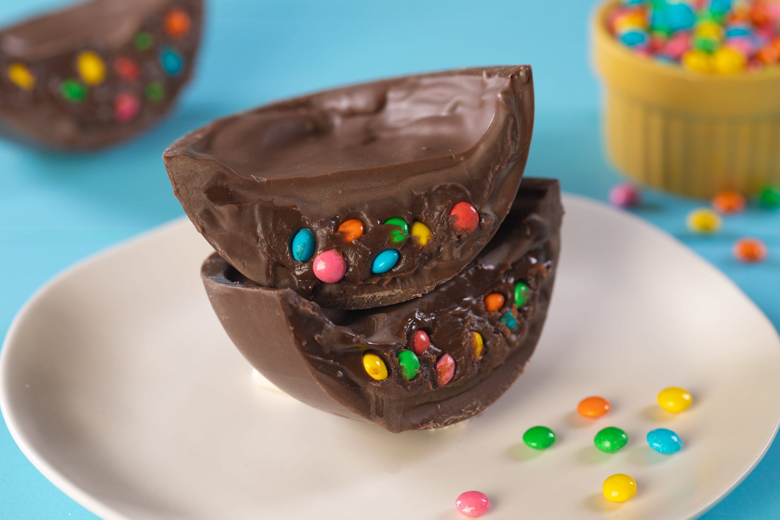Em um recipiente misture o recheio brigadeiro com os Chocogiros Colorido e recheie as casas dos ovos. Para selar o recheio derreta a Cobertura ao Leite derretida em banho-maria ou micro-ondas, deixe secar.