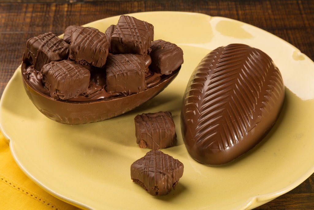 Recheie a casca do ovo com o recheio trufado, reserve. Corte o brownie já frio em quadradinhos e banhe na Cobertura Meio Amarga derretida em banho-maria ou micro-ondas e deixe secar sobre um papel manteiga. Após secar decore o ovo.