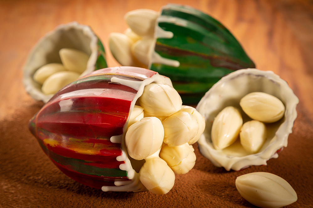 Casca: Em um recipiente, derreta a Cobertura Branca em banho-maria ou micro-ondas. Divida em três recipientes e tinja com os corantes próprios para chocolate vermelho, verde e amarelo, misture bem. Reserve. Em outro recipiente, derreta a Cobertura Meio Amarga em banho-maria ou micro-ondas. Com o auxílio de uma luva faça detalhes na forma de ovo de silicone no formato de cacau com a Cobertura Branca tingida de vermelho, verde e laranja e com a Cobertura Meio Amarga. Deixe secar e em seguida preencha a casca com a Cobertura Branca derretida, seguindo as instruções do fabricante. Leve à geladeira até ficar opaca. Retire, corte ao meio, cole as partes com a cobertura derretida. Espere secar e com Cobertura derretida cole os bombons recheados derretida.