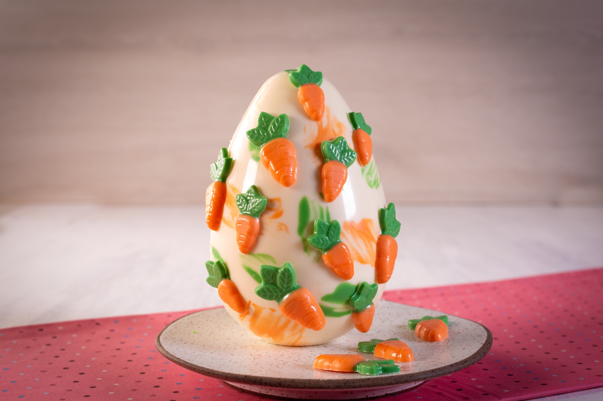 Casca: Em um recipiente, derreta a Cobertura Branca em banho-maria ou micro-ondas, reserve. Faça detalhes com a Cobertura tingida de laranja e verde na forma do ovo, espere secar e preencha a forma de silicone com a Cobertura derretida reservada, seguindo as instruções do fabricante. Leve à geladeira até ficar opaca, retire, desenforme e reserve.