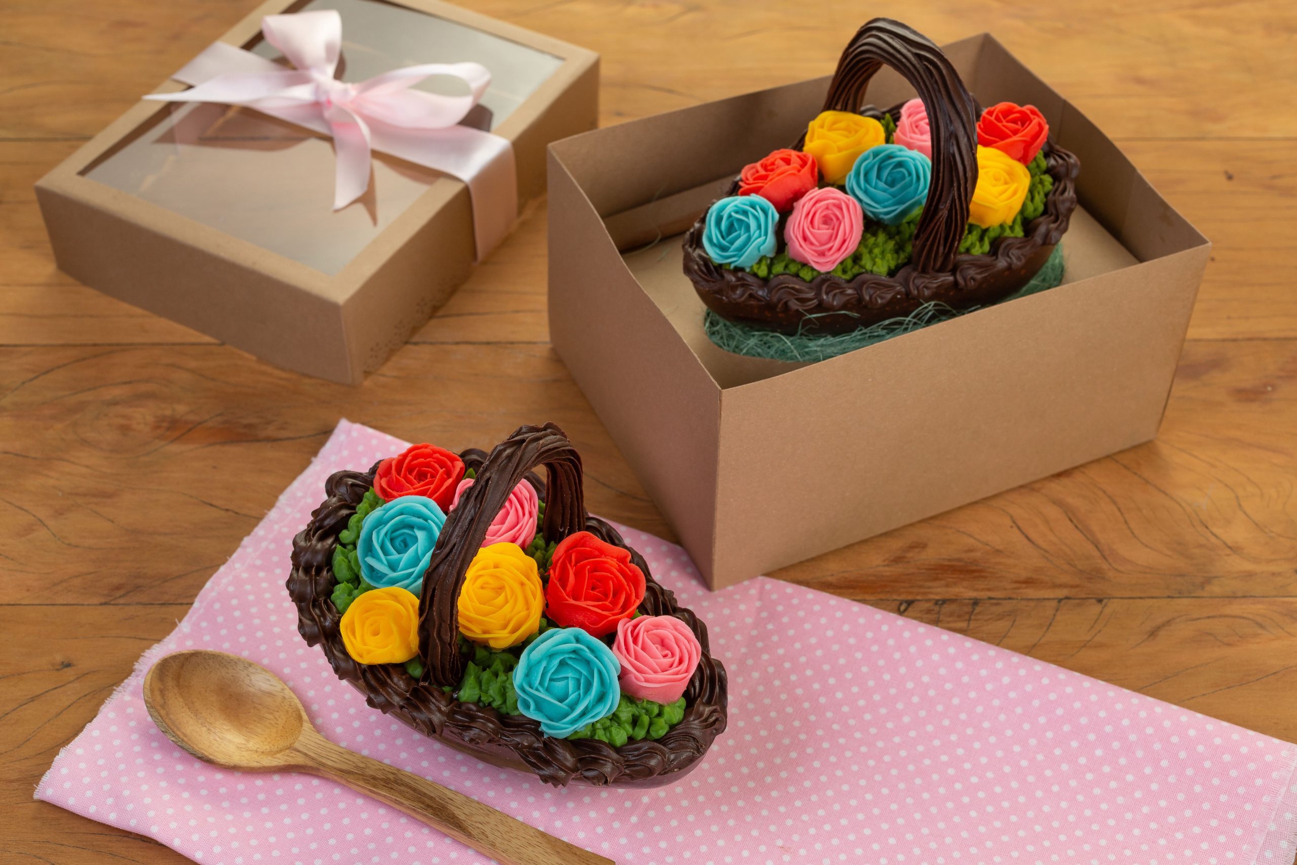 Flores de Chantilly Plástico: Hidrate a gelatina com água e reserve. Em um liquidificador coloque o leite em pó, amido de milho, creme de leite, leite condensado, água e a gelatina derretida, bata muito bem. Em seguida coloque o líquido em uma panela, acrescente a Cobertura Branca, o Aroma de Baunilha Branca, cozinhe até formar um creme firme e que desgrude da panela, reserve. Depois de frio acrescente o chantilly batido e misture. Divida em 5 recipientes e tinja com Corante Rosa, Amarelo, Azul Royal, Vermelho, Verde Folha, misture até ficar na cor desejada. Coloque os cremes rosa, amarelo, azul royal, vermelho em Mangas de Confeitar com Bico 104. Coloque um pedaço de papel-manteiga sobre uma Base para Flores de Metal e faça flores, deixe secar. Coloque o creme verde em uma Manga de Confeitar com Bico 234 e preencha o ovo para fazer a graminha. Retire as flores já secas do papel-manteiga e coloque sobre a graminha.