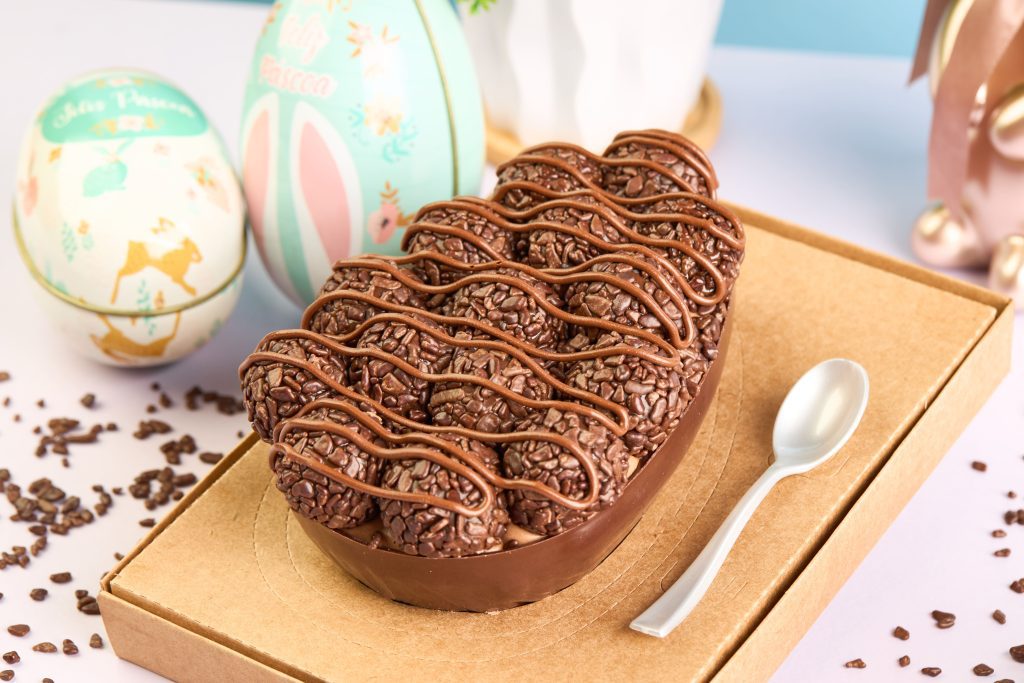 Casca: Em um recipiente derreta a Cobertura Blend em banho-maria ou micro-ondas. Preencha a forma de ovo de silicone seguindo as instruções do fabricante. Leve à geladeira até ficar opaca, retire e desenforme.