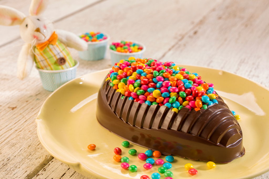 Em um recipiente, derreta a Cobertura Meio Amarga em banho-maria ou micro-ondas. Reserve. Coloque as Minipastilhas Coloridas em formas de ovos de silicone, por cima despeje a Cobertura derretida reservada. Passe a Cobertura sobre toda a lateral do ovo e leve à geladeira até ficar opaca. Retire com cuidado e embrulhe em uma folha transparente para aparecer o detalhe na casca.