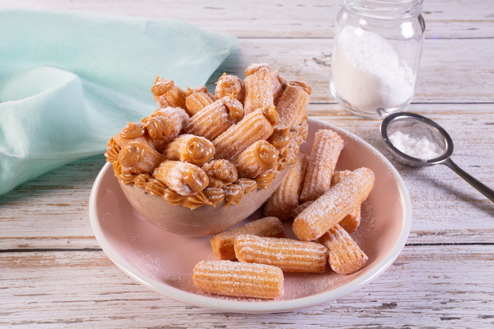 Massa de Churros: Em uma panela, coloque a água, a manteiga sem sal, o sal e o açúcar refinado, misture bem e leve ao fogo até ferver. Em seguida, acrescente a farinha de trigo e misture muito bem até formar uma massa. Desligue, coloque a massa na batedeira, bata para esfriar um pouco, utilizando o batedor raquete. Acrescente o ovo e bata mais, até obter uma massa lisa. Desligue e coloque a massa em uma Manga de Confeitar com Bico 6B, pressione sobre um papel-manteiga e corte no tamanho desejado. Em seguida, frite no óleo quente.