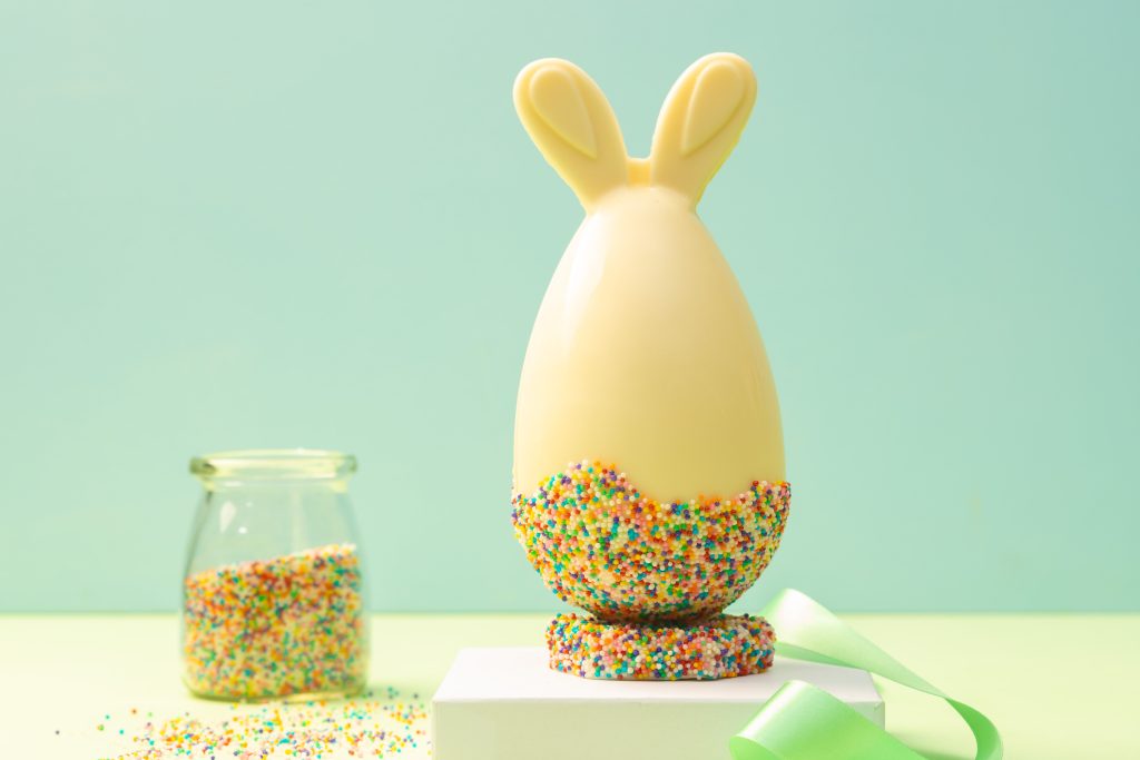 Casca e Base: Em um recipiente derreta a Cobertura Branca em banho-maria ou micro-ondas. Preencha a forma de ovo de silicone seguindo as instruções do fabricante. Leve à geladeira até ficar opaca, retire e desenforme. Para a base coloque um pouco de Cobertura Branca derretida em um copo plástico e leve para geladeira até cristalizar, retire e desenforme, reserve.