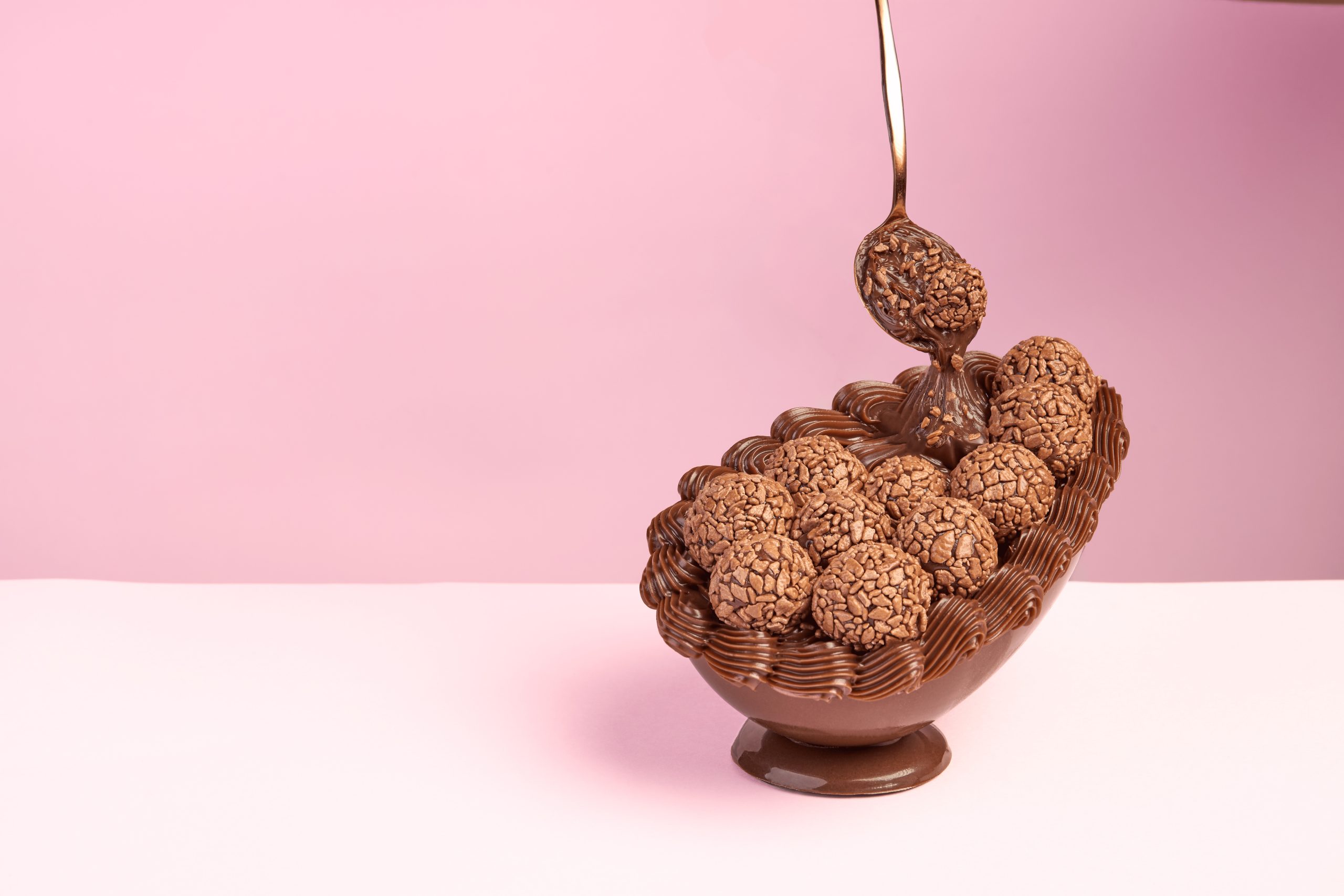 Enrole o brigadeiro com 15 g cada, passe no confeito granulado crocante e reserve. Coloque o recheio cremoso no saco de confeitar com o bico, recheie a casca e faça a decoração com o bico ao redor da casca e finalize no centro com os brigadeiros.