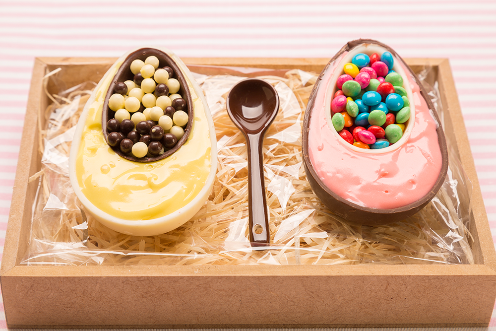 Casca dos ovos: Em recipientes separados derreta as Coberturas Branca e ao Leite em banho-maria ou micro-ondas. Modele nas formas de ovos de 150 g e de 50 g e leve à geladeira até ficar opaca. Retire e reserve.