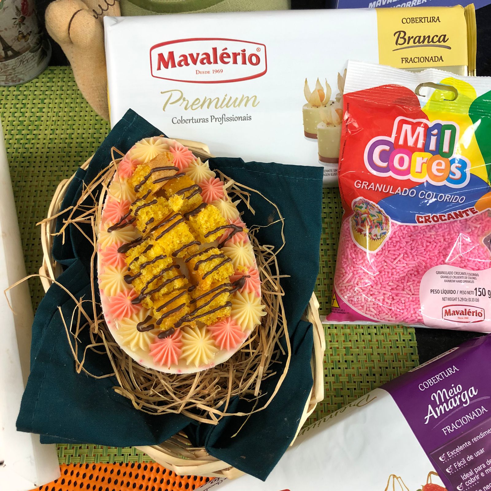 Casca: Em um recipiente separado derreta a Cobertura Branca em banho-maria ou micro-ondas. Em seguida coloque o Granulado Colorido, misture e preencha uma forma de ovo de silicone seguido as instruções da embalagem. Leve para geladeira até ficar opaca, retire e reserve.