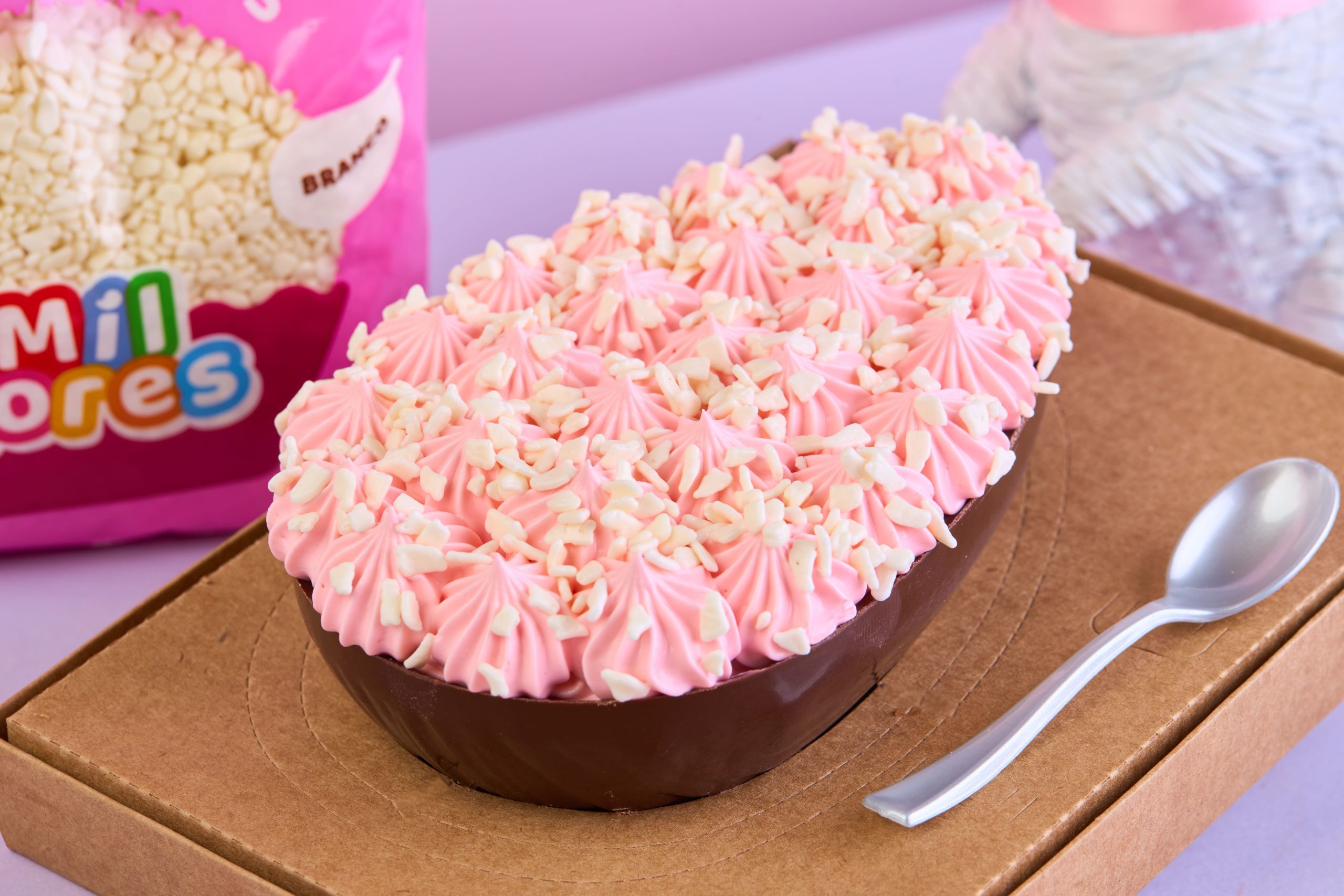 Montagem: Coloque a casca em uma caixa para ovo de colher, recheio com o mousse de morango, coloque um pouco do mousse em um saco de confeitar com bico 4B, faça pitangas em cima e decore com o flocos branco.