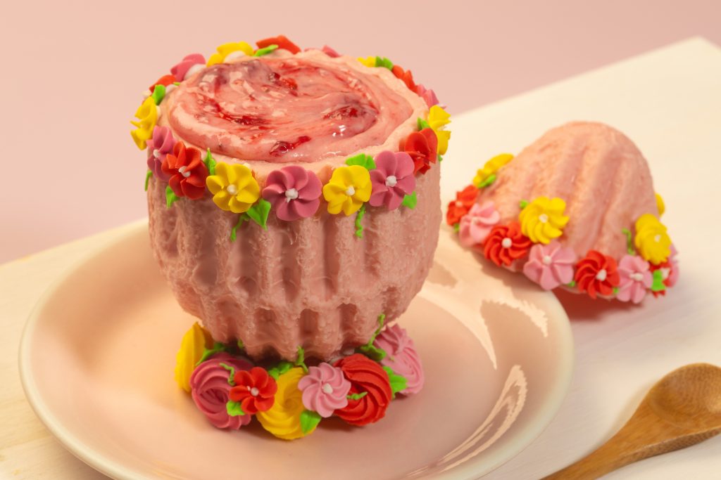 Montagem: Coloque o recheio trufado de morango dentro do ovo. Em seguida cole as flores de glacê no ovo utilizando cobertura derretida.