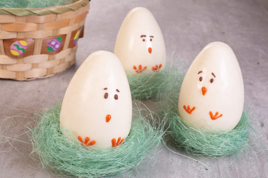 Decoração: Em um recipiente, derreta a Cobertura Branca em banho-maria ou micro-ondas, coloque o corante próprio para chocolate laranja, misture bem até ficar na cor desejada. Em seguida, coloque em uma Manga de Confeitar, faça o desenho das patinhas e do bico do pintinho. Derreta a Cobertura ao Leite em banho-maria ou micro-ondas, coloque em um Saco de Confeitar e faça o desenho dos olhos e sobrancelhas.