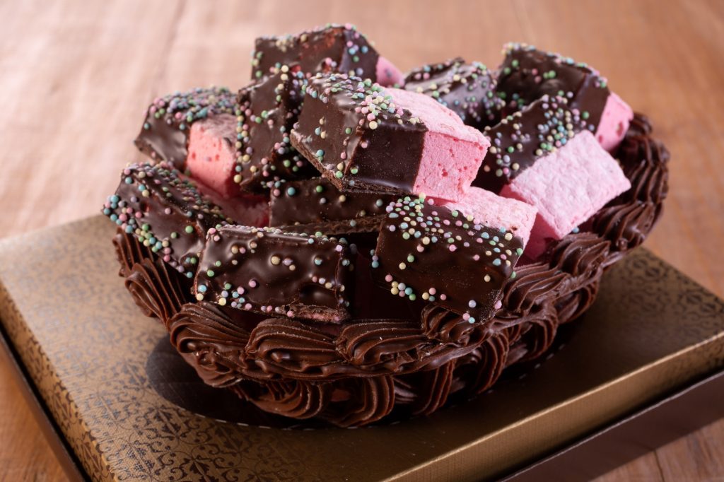 Marshmallow de Morango: Em um recipiente, ferva a água, desligue, acrescente a Gelatina de Morango, a Gelatina Incolor e misture bem até dissolver. Em seguida, bata na batedeira com o açúcar refinado e o Pó de Morango, até montar. Unte uma assadeira 22 x 32 cm com óleo ou desmoldante, polvilhe Açúcar de Confeiteiro e espalhe o marshmallow. Em seguida, leva à geladeira, até ficar firme.