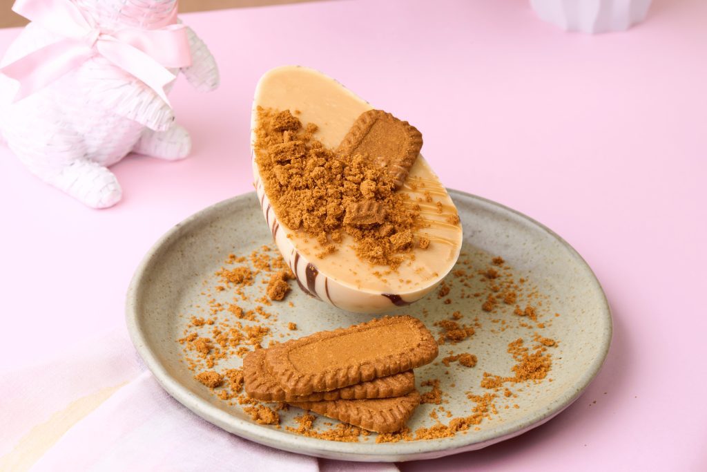 Montagem e decoração: Coloque o recheio no saco de confeitar, preencha a casca com o recheio e decore com o biscoito speculoos.