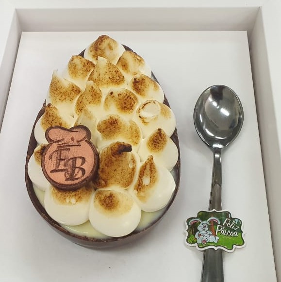 Com o auxílio de uma manga de confeitar, coloque uma camada de creme de brigadeiro, e uma camada de creme de limão, dentro da casca crocante, finalize com o merengue.