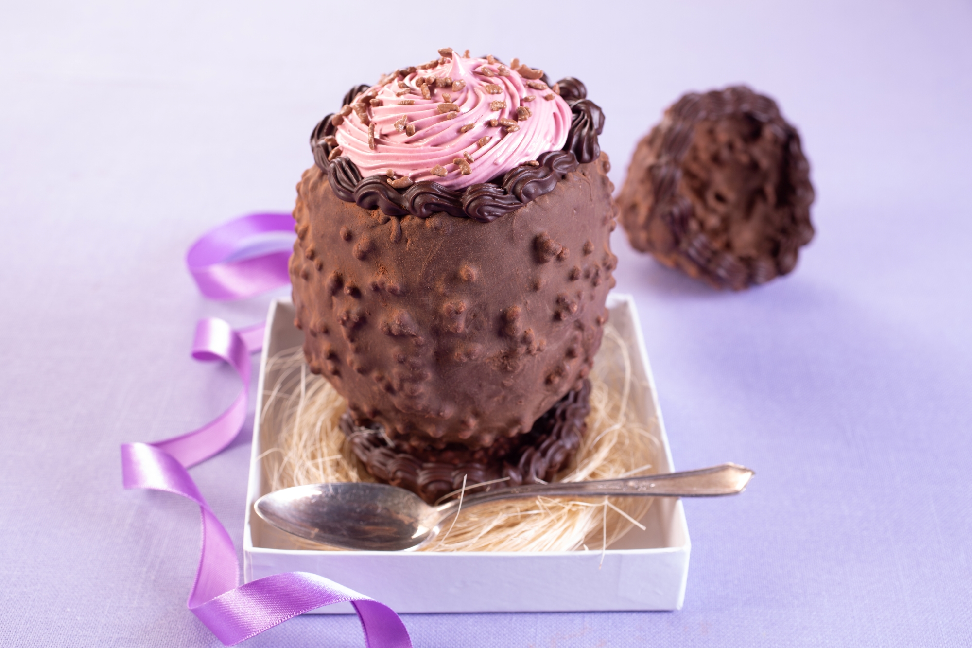 Em um recipiente, derreta a Cobertura Meio Amarga em banho-maria ou micro-ondas, coloque o rum aos poucos, misture até começar a engrossar. Coloque em uma Manga de Confeitar com Bico 21, pressione, fazendo uma base e cole a casca do ovo. Em seguida, decore a borda do ovo e, utilizando uma Manga de Confeitar com Bico 6B recheie com o recheio de mousse de frutas vermelhas. Finalize com Flocos Crocantes.