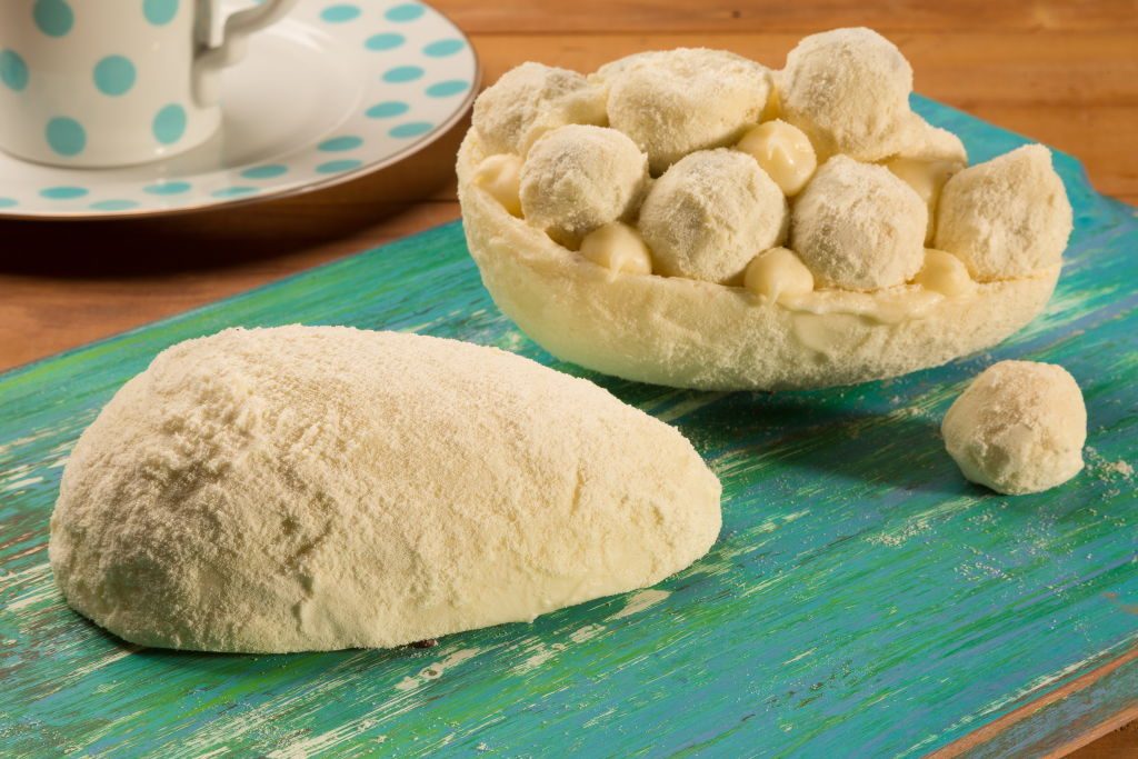 Casca do Ovo: Em um recipiente derreta a Cobertura Branca em banho-maria ou micro-ondas. Coloque em formas de ovos de silicone seguindo as instruções do fabricante. Leve à geladeira até ficar opaca. Retire, passe a Cobertura derretida na casca do ovo e passe no leite em pó. Reserve.