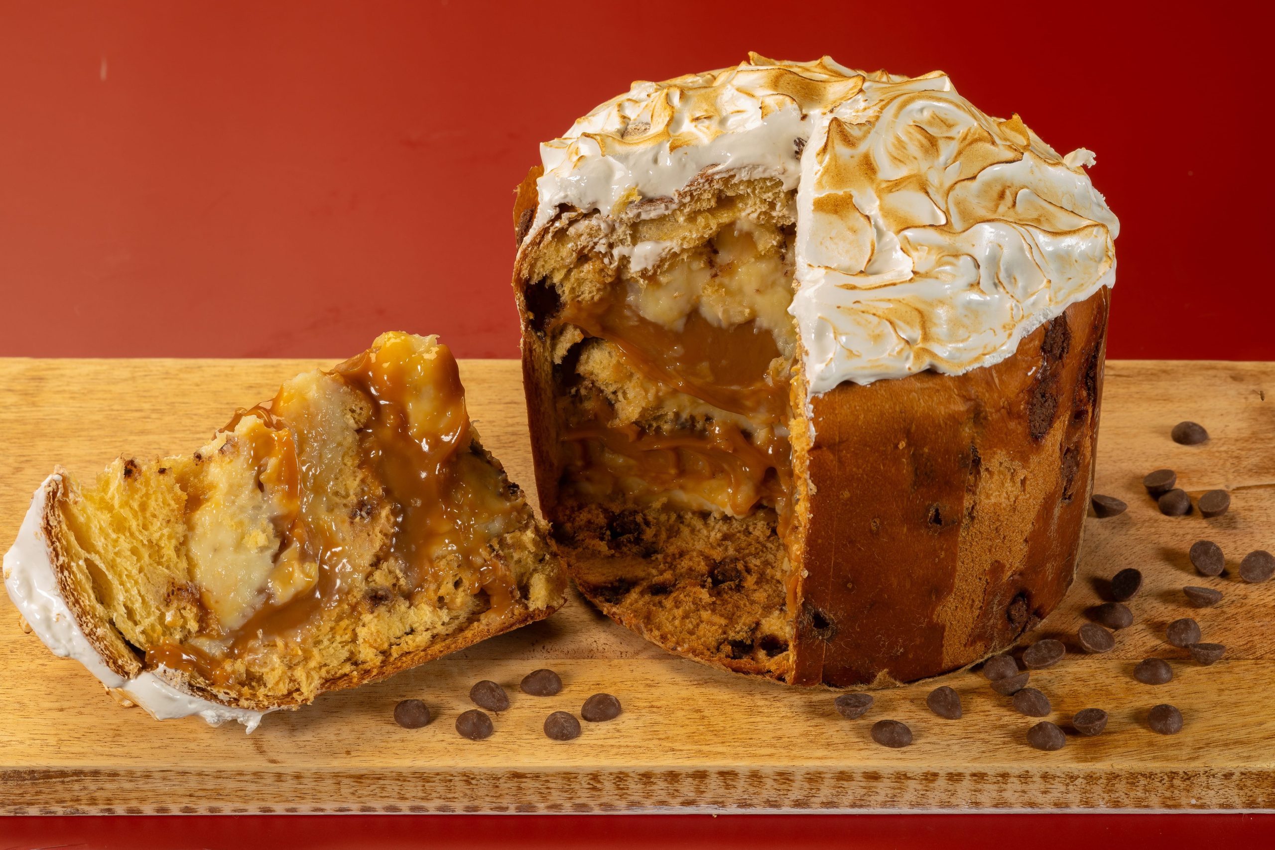 Recheie os panetones intercalando camadas do brigadeiro de banana, do miolo do panetone e do brigadeiro doce de leite, reserve. Na batedeira, coloque a Cobertura Marshmallow e a água gelada, misture, bata em velocidade alta até montar. Em seguida Espalhe sobre o panetone e passe o maçarico.
