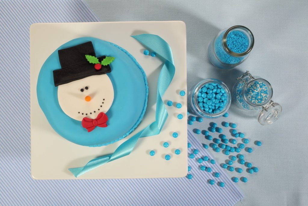Corte a tampa do panetone e retire o miolo deixando um dedo de massa na lateral. Recheie o panetone intercalando com o miolo, e finalize com o restante do miolo. Reserve. Deixe descansar por 40 minutos. Em seguida, retire a embalagem de papel do panetone e cubra com a Pasta tingida com corante em gel azul. Tinja a Pasta Americana com corante em gel vermelho para fazer o laço, com o laranja para fazer o nariz, com o verde para fazer a folhinha e com o preto para modelar o chapéu e os olhinhos. Use o Confeito Miçanga Preta para fazer a boquinha.