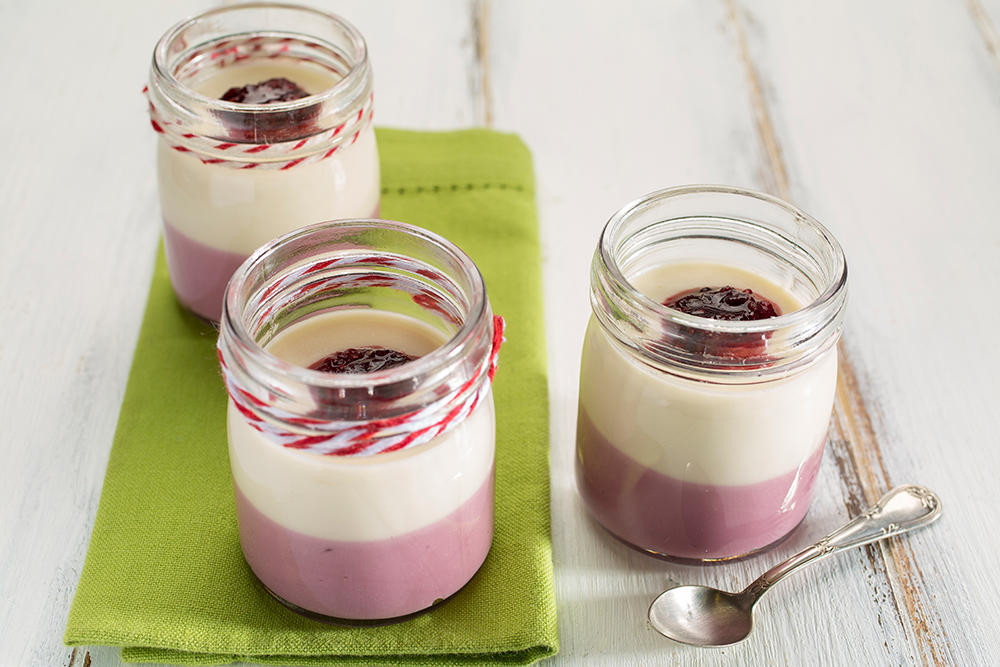 Coloque o creme de frutas vermelhas em taças até à metade, complete com o creme da panna cotta e leve à geladeira até ficar firme. Retire e coloque geleia de frutas vermelhas.