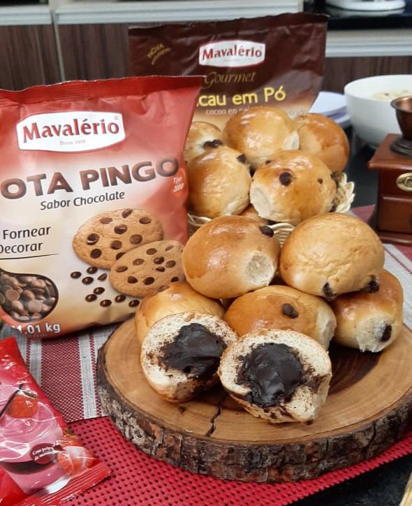 Massa: Em um recipiente, coloque o Fermento Seco e 50 ml da água, misture até formar uma pastinha e deixe reservado por 10 minutos. Em seguida, coloque a farinha de trigo, a margarina sem sal, o leite em pó, o açúcar refinado, a gema e o sal. Misture e acrescente a água aos poucos até obter uma massa enxuta. Sove muito bem e acrescente as Gotas de Chocolate, misture na massa e deixe descansar por 20 minutos. Modele bolinhas de 30 g e deixe crescer até dobrar o tamanho. Pincele gema e leve para assar em forno preaquecido a 180 °C por aproximadamente 15 minutos.