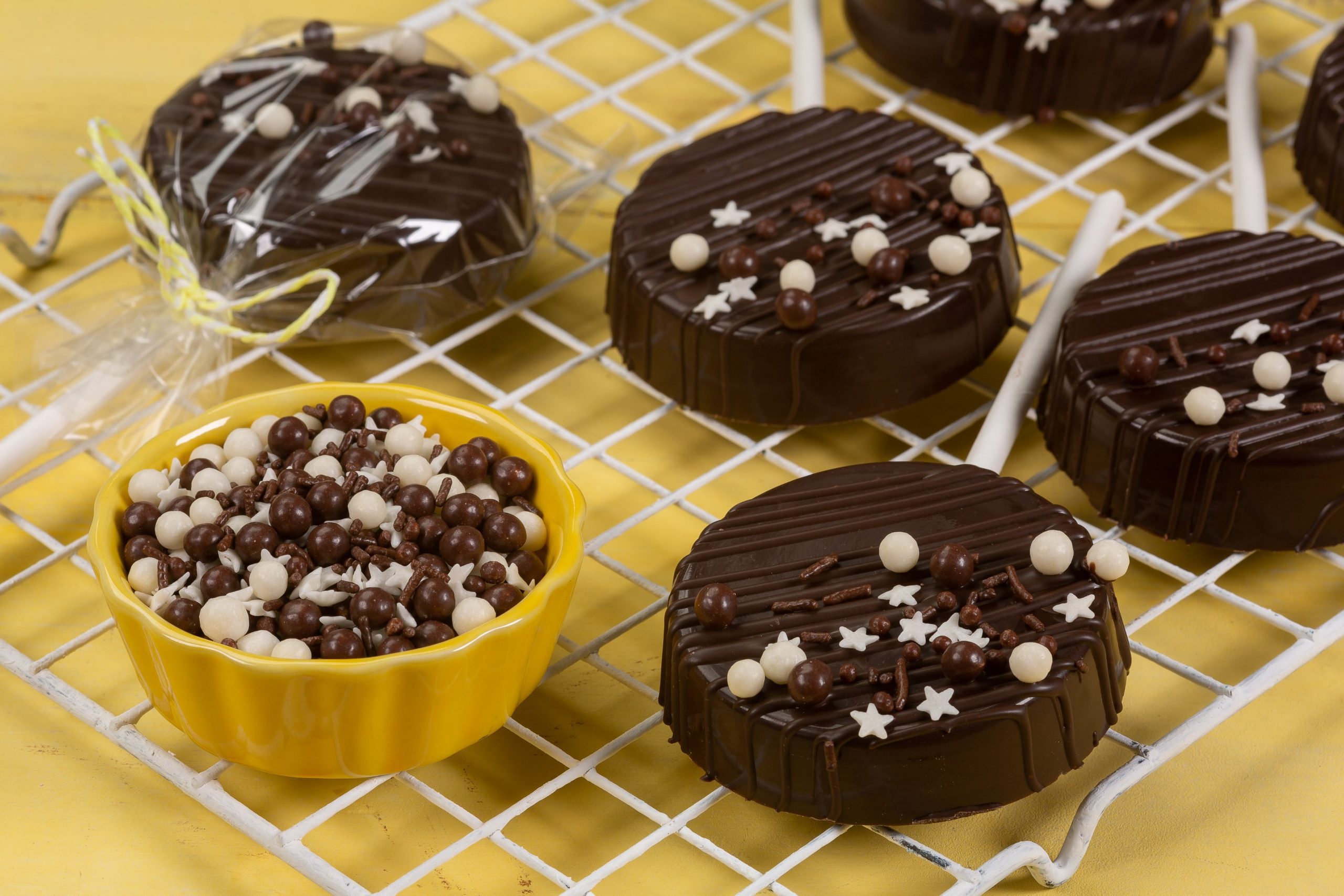 Coloque um palito na casquinha do pão de mel, espelhe o recheio brigadeiro doce de leite, fatia da massa e sele com a cobertura derretida e deixe secar. Coloque a cobertura derretida em uma Manga de Confeitar, faça risquinhos e decore com o Mix de Confeitos Marrom e Branco.