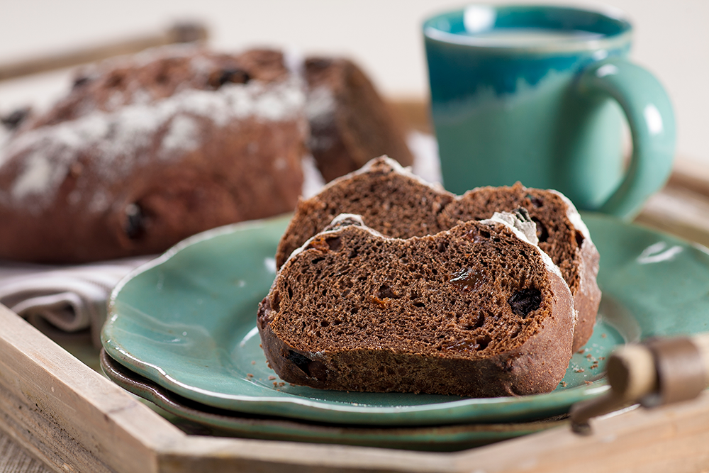 Em um recipiente, coloque a farinha de trigo, a farinha integral, a farinha de uva, o Cacau em Pó, os Açúcares, o leite em pó, o sal, o melhorador de farinha e o fermento, misture muito bem dando ponto com o vinho até ficar uma massa lisa e enxuta, coloque as passas e misture novamente, corte os pães no modelo desejado, e deixe descansar por 30 minutos. Após esse descanso modele novamente e deixe crescer até dobrar de volume, asse o pão em forno quente 180 °C, por aproximadamente 25 minutos, decore com farinha e Cacau em Pó.