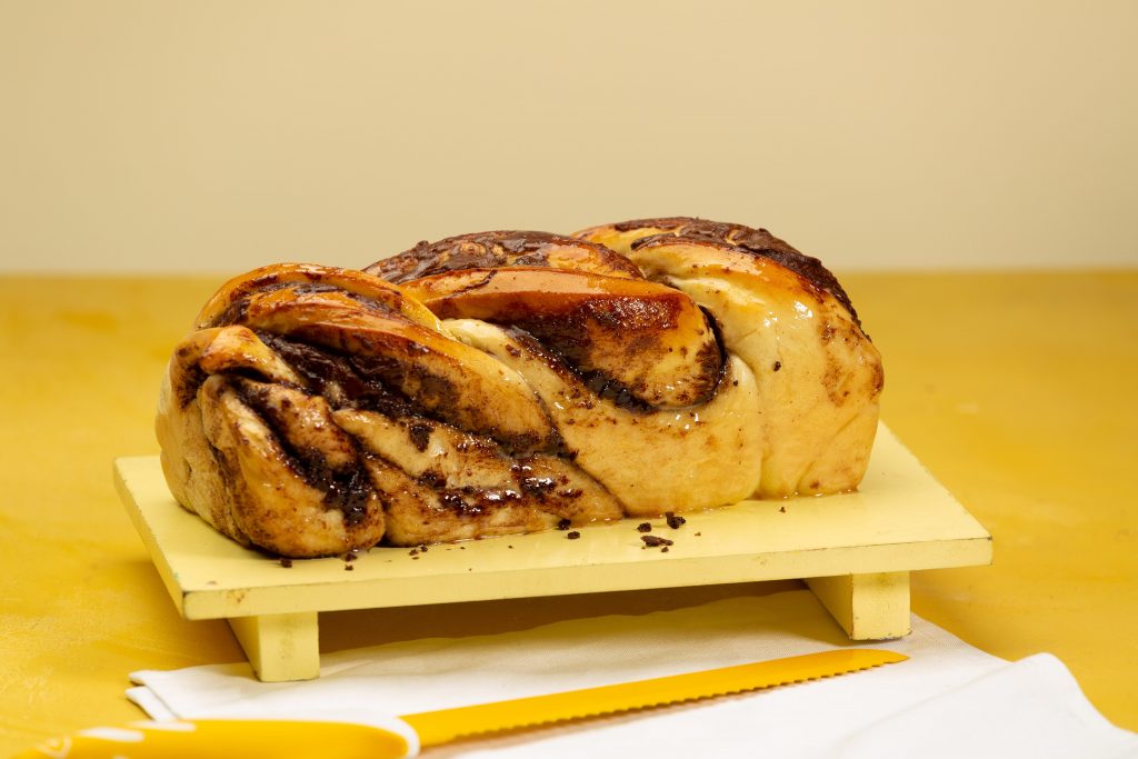 Abra a massa com o auxílio de um rolo, espalhe o Recheio Sabor Avelã.  Enrole como rocambole, corte ao meio e faça uma trança. Coloque em uma assadeira e deixe crescer até dobrar o volume. Em seguida, leve para assar em forno preaquecido a 160 °C por aproximadamente 30 minutos.