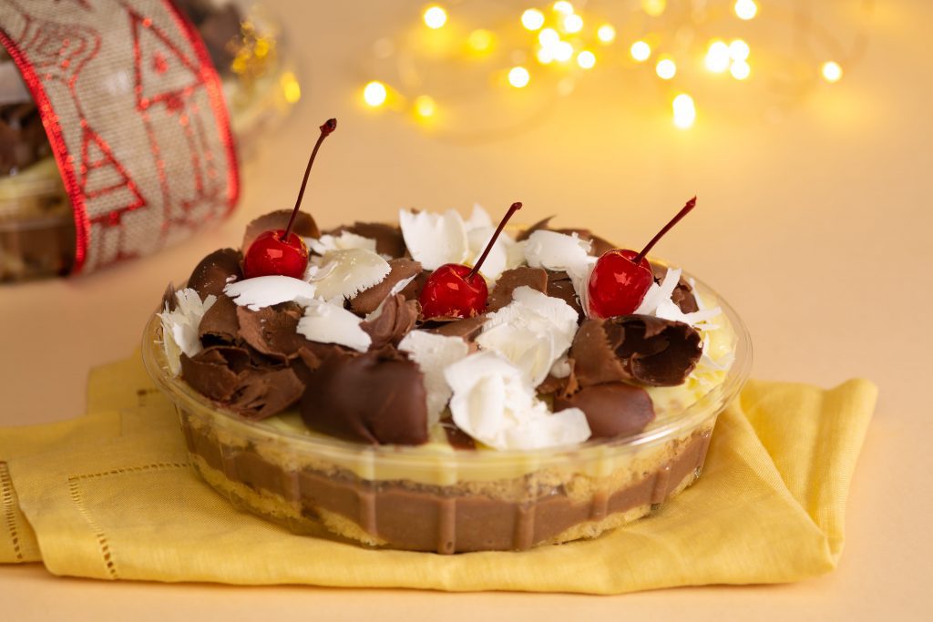 Em uma embalagem para minicolomba, intercale camadas de fatias de chocotone, creme de chocolate e o creme de nozes. Finalize com raspas de Cobertura Branca e Blend e cerejas com cabo.