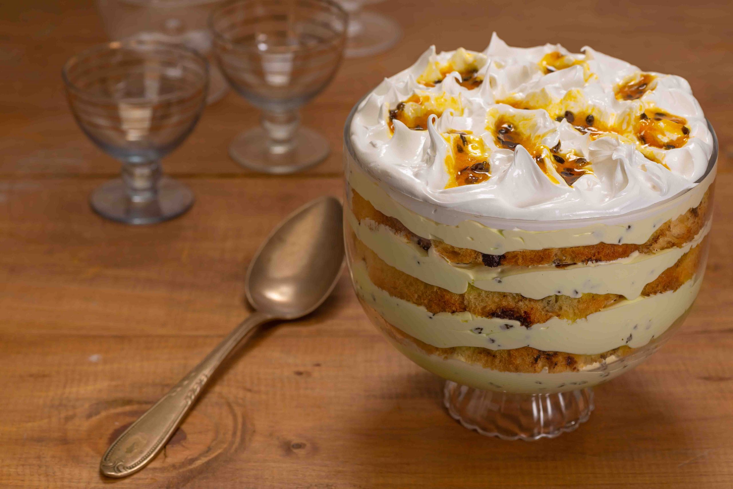 Em uma taça de sua preferência, intercale fatias de panetone, mousse de maracujá. Espalhe o marshmallow e com auxílio de uma colher faça movimentos irregulares. Finalize, decorando com a geleia de maracujá.