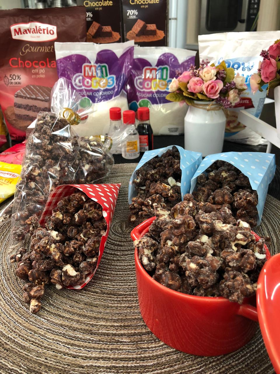 Em uma pipoqueira, coloque o milho, o açúcar refinado, o óleo, a água e deixe estourar por completo. Em seguida, coloque em um recipiente grande e despeje a Cobertura Meio Amarga derretida em banho-maria ou micro-ondas. Logo em seguida, acrescente o leite em pó, misture e leve para gelar por 1 hora. Coloque nos potes ou saquinho de sua preferência.