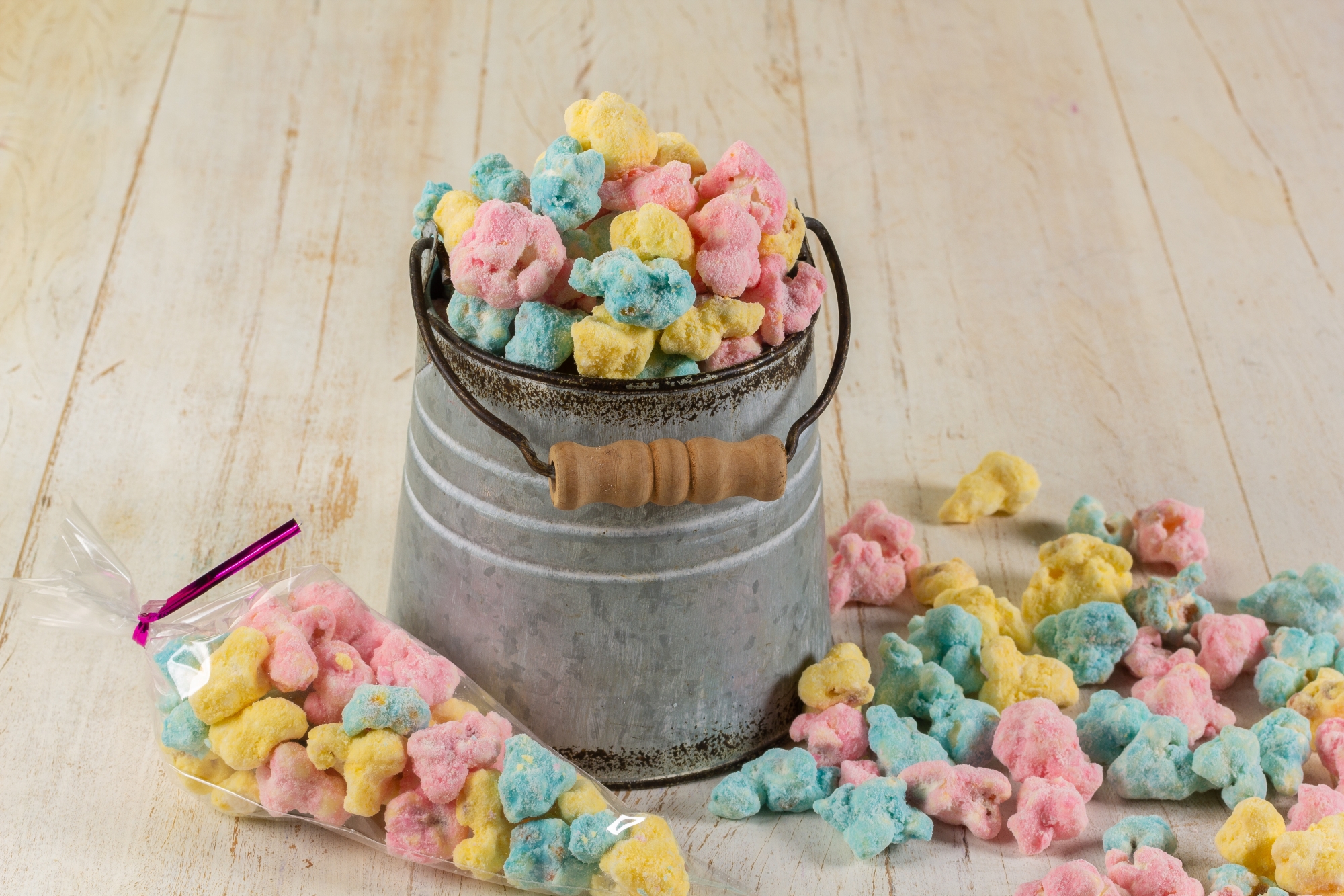 Para Saborizar: Em um recipiente, derreta a Cobertura Branca em banho-maria ou micro-ondas, divida em três recipientes e tinja com corantes próprios para chocolate nas cores azul, rosa e amarelo, misture bem até ficar na cor desejada. Em seguida, espalhe as Coberturas tingidas nos recipientes das pipocas reservadas e misture bem. Divida o leite em pó nas pipocas, mexa bem, espalhe sobre uma assadeira e deixe secar.