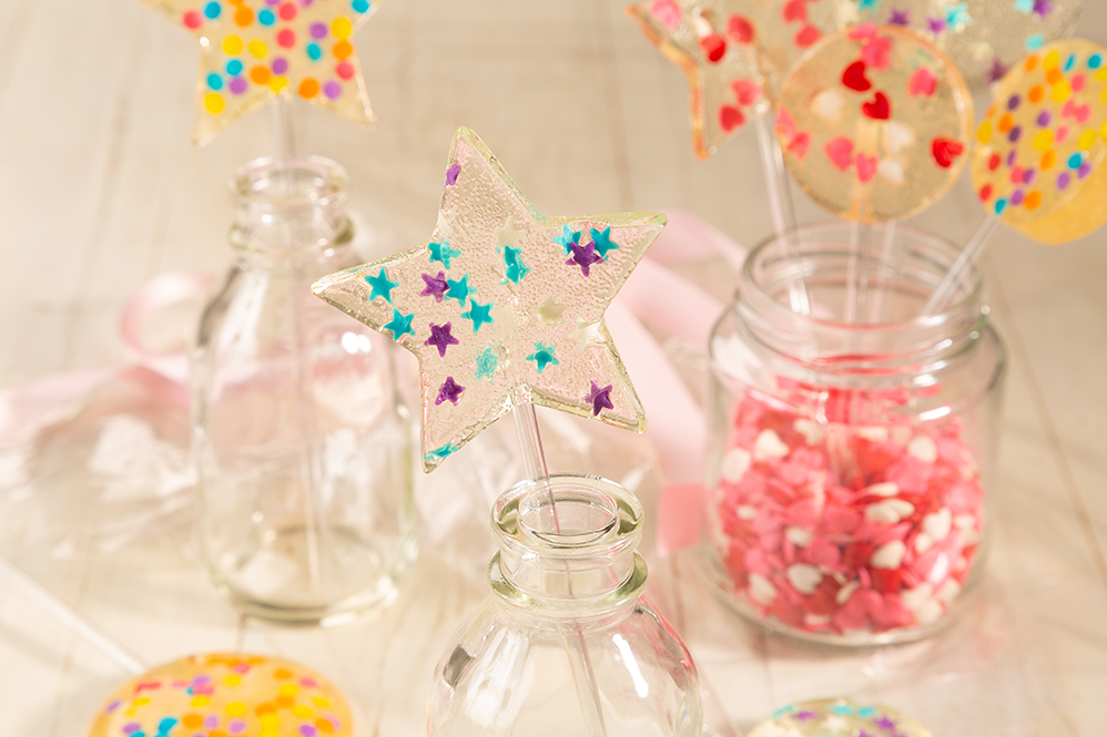 Em uma panela, coloque o Açúcar Branco, a glucose e a água, leve ao fogo alto, sem misturar. Quando começar a ferver passe um pincel com água nas laterais. Quando chegar na temperatura 115 °C a 120 °C, desligue e coloque em forminhas de silicone de pirulitos com os Confeitos Figuras Estrelinha Branca, Azul e Lilás, Confete, Coração e coloque os palitos. Deixe secar, retire das forminhas e embale em seguida.