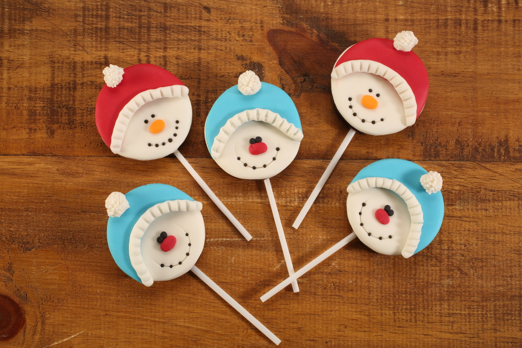 Tinja a Pasta Americana com corantes em gel, azul, laranja, vermelho e preto e modele um boneco de neve. Use o Confeito Miçanga Preta para fazer a boquinha e os olhinhos.