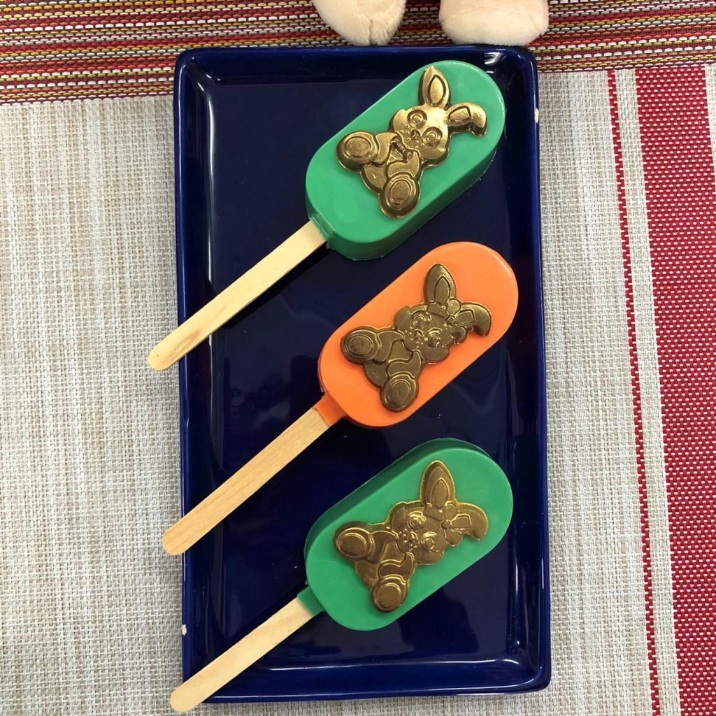 Decoração: Em um recipiente, derreta a Cobertura ao Leite em banho-maria ou micro-ondas. Coloque em um cone de papel-manteiga e preencha as forminhas no formato de coelho, leve para gelar até a forma ficar opaca, retire e decore o pirulito.