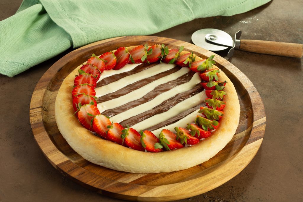 Intercale os Recheios Forneáveis Chocolate Branco e ao Leite na massa pré-assada, e volte mais 15 segundos para o forno. Retire e decore com morangos fatiados.