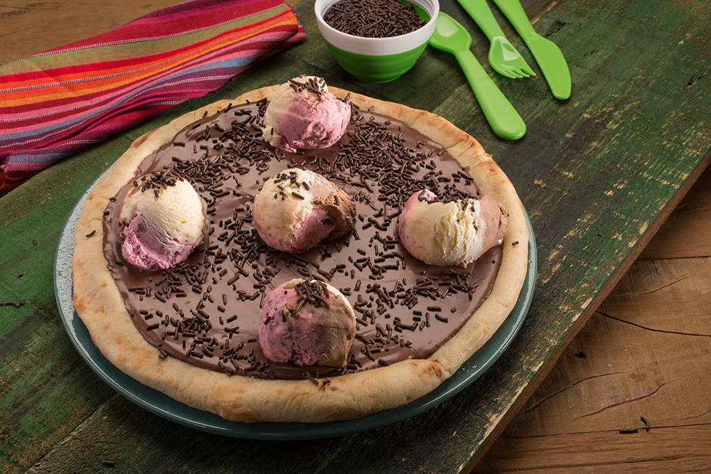 Recheio e Montagem: Espalhe o Recheio Forneável na massa pré-assada e volte ao forno para aquecer e derreter. Em seguida, decore com o Granulado e com as bolas de sorvete.