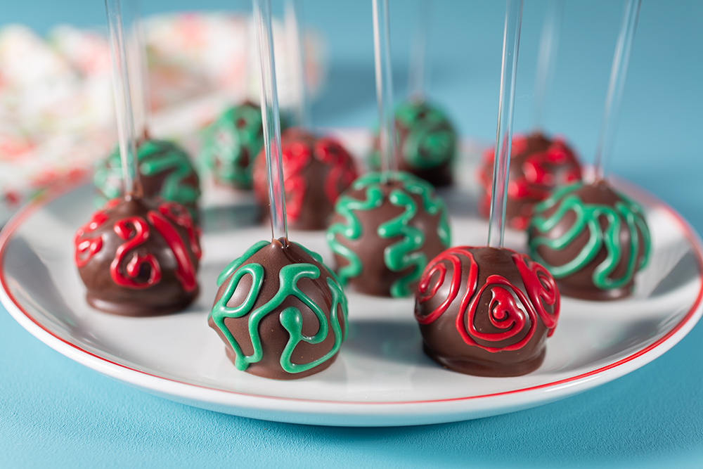 Decoração: Passe o palito na Cobertura Blend derretida em banho-maria ou micro-ondas, espete nas bolinhas e espere secar. Em seguida banhe as bolinhas na Cobertura Blend derretida, deixe secar sobre um papel manteiga. Reserve. Em um recipiente, derreta a Cobertura Branca em banho-maria ou micro-ondas, divida em dois potinhos e coloque os corantes verde e o vermelho, mexa até ficar na cor desejada. Em seguida coloque em mangas de confeitar e decore.