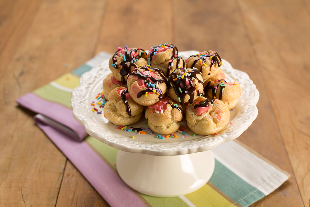 Coloque o recheio em uma manga de confeitar com bico perlê e recheie a Carolina. Em seguida, espalhe a cobertura já fria sobre as carolinas recheadas e finalize com o Granulado Colorido.
