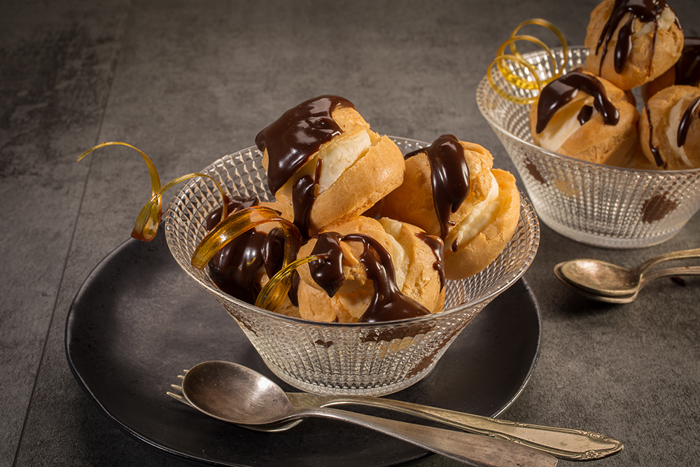 Coloque o recheio em uma manga de confeitar e recheie os profiteroles, decore com a cobertura de ganache.